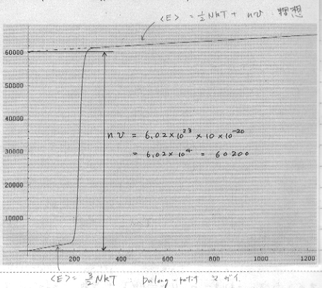 で、右上の図が S 君が描いてくれたグラフ。 もちろん、低温・高温での漸近評価から得られる結果そのままだけれど、 目ではっきり見るのもまたいい。 たしかに、低温では大きな傾きをもった直線だが (図に「Dulong-Petit まがい」とあるが、 こういう場合の日本語としては「Dulong-Petit もどき」 がより適切であるぞ。S さん)、 高温ではより小さな傾きの直線になっている。 (しつこいが、これは toy model であり、 ここに見られるのは本当の相転移でないことに注意。)