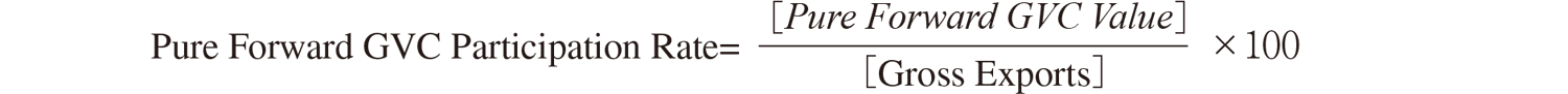 通常のForward Participationは,多段階の再輸出を含むため,同じ付加価値が複数回計上される(二重計上)の問題がある。このため,一次の輸出先(1ホップ目)での加工・再輸出分のみを捉える「Pure forward GVC participation」という概念が用いられる。