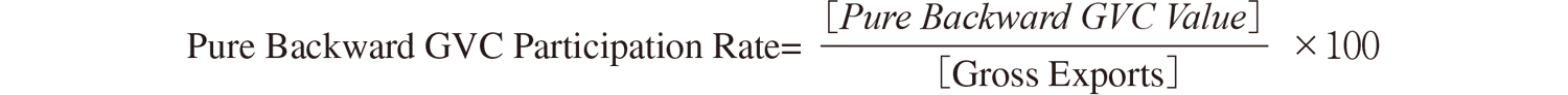 Pure backward GVC participation総額: 自国が輸入した中間財に含まれる外国付【92頁】加価値(FVA: Foreign Value Added)のうち,一度だけ自国で加工されて再輸出される部分の金額。