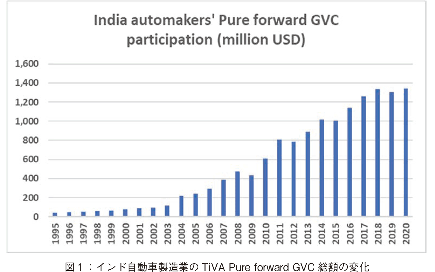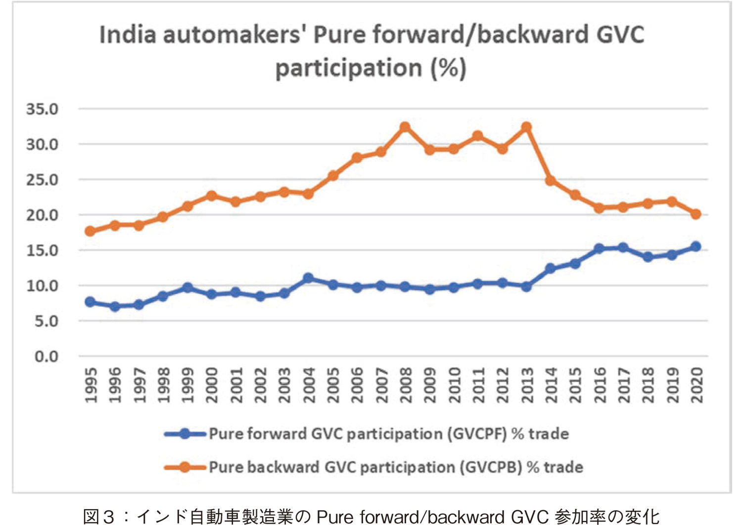 2000年代に入ると,市場自由化と外国OEMの参入により競争が激化し,Maruti Suzukiはサプライヤーに品質改善やコスト削減を徹底させ,Tier1企業の能力向上を牽引した。Sturgeonらが論じたモジュール化と国際分業の進展はインドにも及び,現地サプライヤーは輸出を含む広域的な生産ネットワークに組み込まれた[19]。ただし,SturgeonとVan Biesebroeck(2008)が指摘するように,インド企業の機能アップグレーディング(設計・研究開発領域への移行)【99頁】 は依然として制約が大きく,製品・プロセス改善が中心であった[20]。しかし,その後,2014年以降のTiVAデータを見ると,pure backward GVC participation(輸入部品依存度)が減少し,forward GVC participation(国内付加価値が海外を経由して最終需要に届く度合い)が増加する傾向が確認された(図3参照)。これは,インドの自動車部品産業が輸入依存型の組立から徐々に脱却し,国内付加価値を海外市場へ供給する方向にシフトしたことを示しており,新たな段階のアップグレーディングが進みつつあると解釈できる。