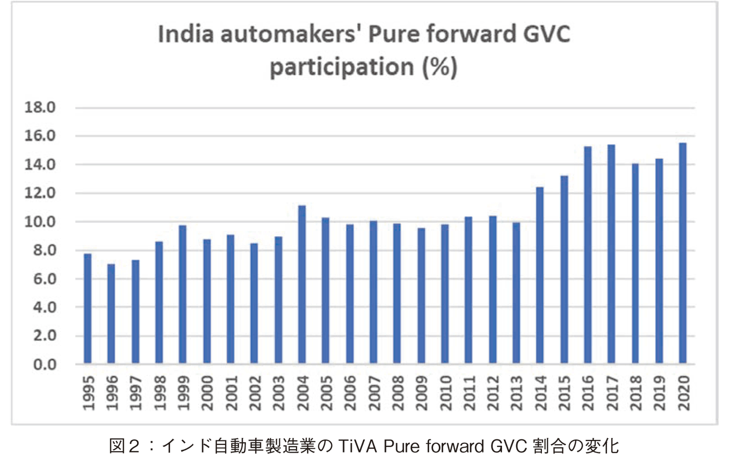 インド,自動車製造企業のPure Forward GVC participationの総額の時系列変化を図1に示した。このデータは,WITSのGVC Trade Table,“GVC Visualization”のサイトから取得したTiVAのPure forwardデータ値である[2]。図2にPure forward参加率(DVAの割合)の時系列変化を示した。こちらも1995年の8%から,2020年の16%へと増加している。