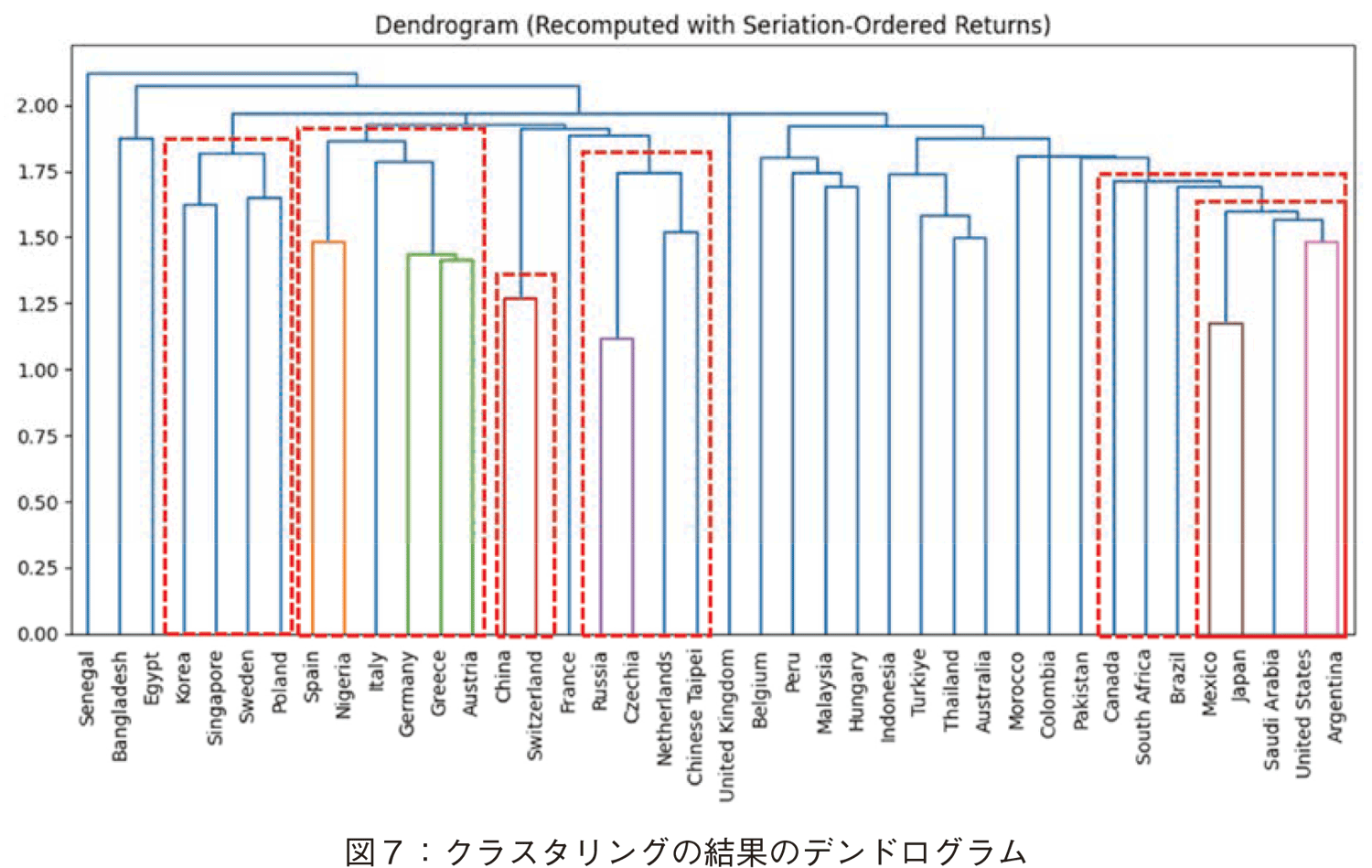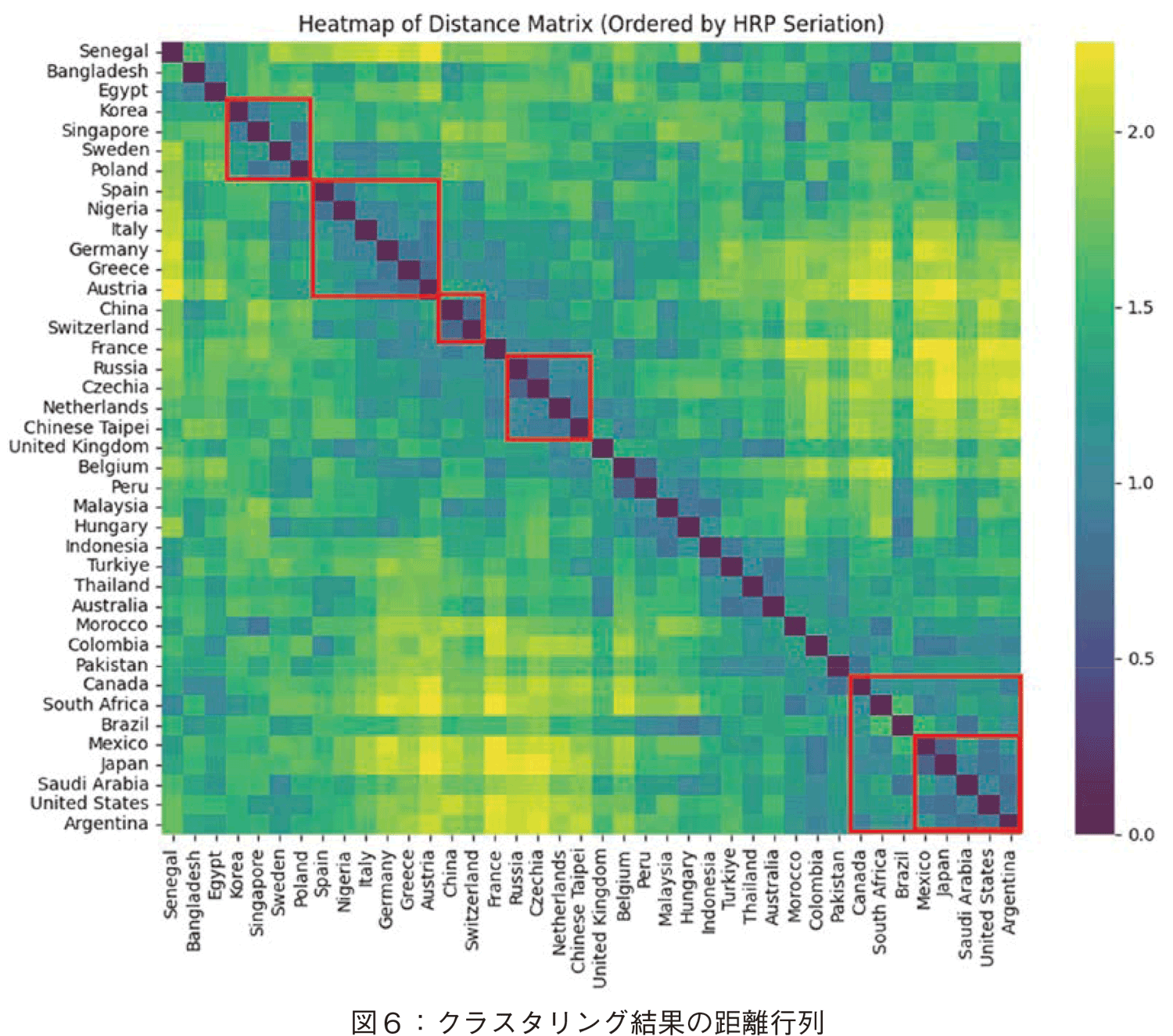が作成された。この距離行列を階層化クラスタリング[23]する。そして,距離行列において国の順番を入れ替え対角線上に距離が小さい(パターンが類似する)国が並ぶようにした。これを准対角化[24]と呼ぶ。図6に准対角化後の距離行列のヒートマップを示す。色が濃いほうが距離が小さく,黒色は距離が0であることを示す。このヒートマップを,図7ではデンドログラムを使って示した。横軸は国名,縦軸の高さは距離を表す。図6と図7では対応するクラスターを線で囲ってある。このように閾値(距離の値の閾値)に関係なく注目するクラスターを抽出して分析することができる。