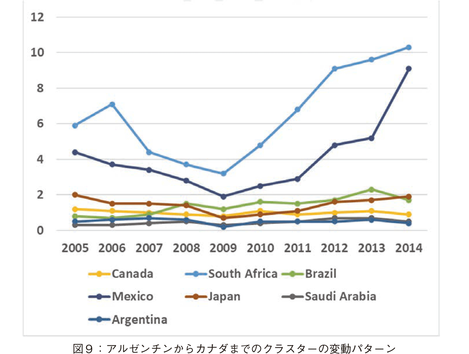 アルゼンチンからカナダまでのクラスター(図9): 上記のクラスターの閾値を大きく取ると,南アフリカが入ってきた。メキシコ及び南アフリカの2009以降の成長が顕著である。