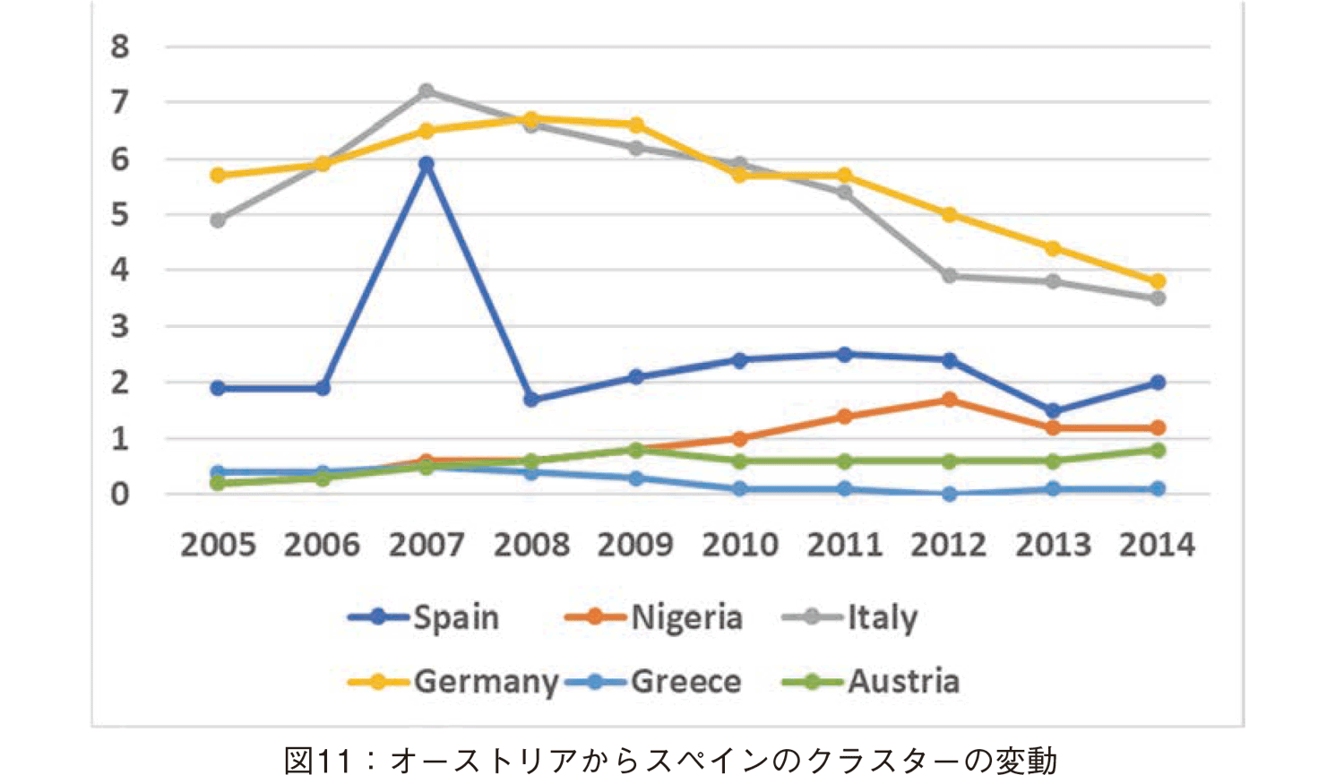 オーストリアからスペインのクラスター(図11): 欧州への輸出の下落を示している。特に,ドイツとイタリアの下落が顕著である。ナイジェリアの値も2012年以降下落していることで,ナイジェリアはこのクラスターに入った。