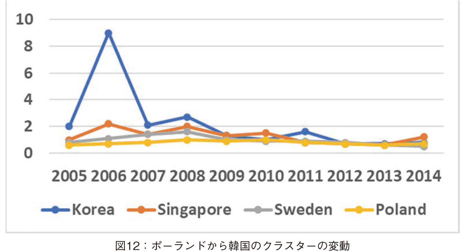 ポーランドから韓国のクラスター: 韓国,シンガポール,スウェーデン,ポーランドも下落傾向を示している。