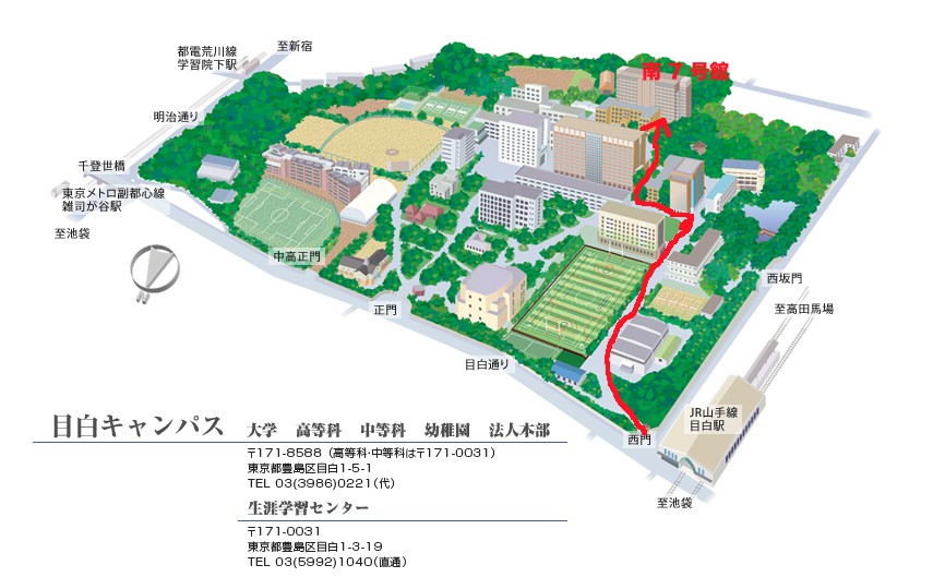 参加登録された方は、当日、会場まで直接お越しください。 学習院大学の西門までは山手線目白駅の改札をでて右方向に進めば(信号が青なら)30 秒です。